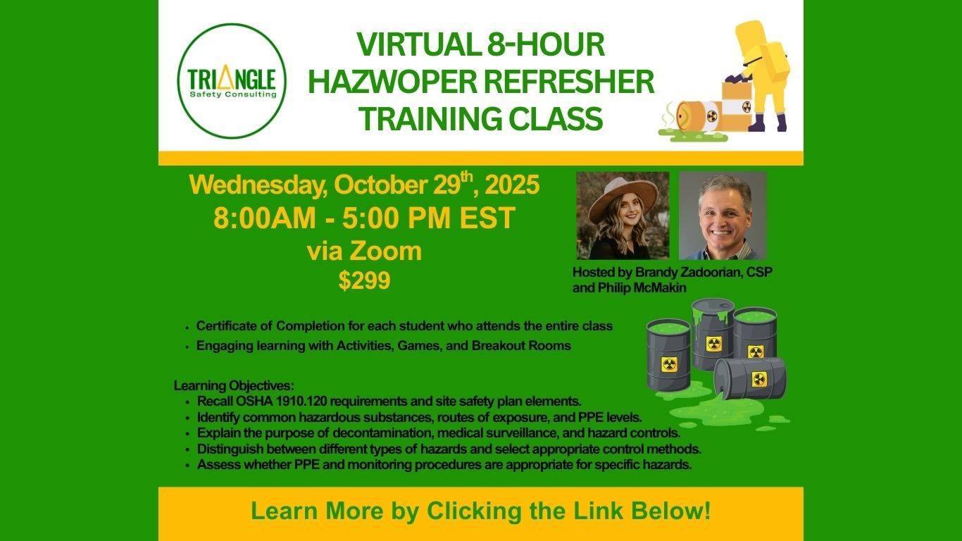 🖥️ This training is interactive, fun, and engaging! You’ll take part in activities, games, and dynamic breakout room discussions that will keep you participating, learning, and energized start to finish. 8️⃣ The 8-Hour HAZWOPER Refresher class is designed to help participants maintain compliance with OSHA’s Hazardous Waste Operations and Emergency Response Standard (29 CFR 1910.120). Ensure employees remain competent in hazard recognition, safe work practices, emergency response, and regulatory requirements when working with hazardous waste or responding to chemical emergencies. 🔚 By the end, students will be able to confidently evaluate hazards, make informed safety decisions, and effectively respond to hazardous material incidents while ensuring regulatory compliance. 🗓️ Date and Time: Wednesday, October 29th, 2025, 8 AM - 5 PM EST 💲 Cost: $299 📍 Location: Your house or work - Virtual via Zoom 🙂 Instructors: Philip M. McMakin and Brandy Zadoorian