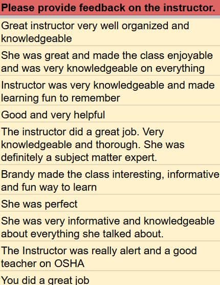 We are big on making our OSHA 10-hour General Industry Outreach classes enjoyable as students learn ways to identify + control hazards that will keep them safe moving forward! The feedback in a recent post-course evaluation left us smiling…
