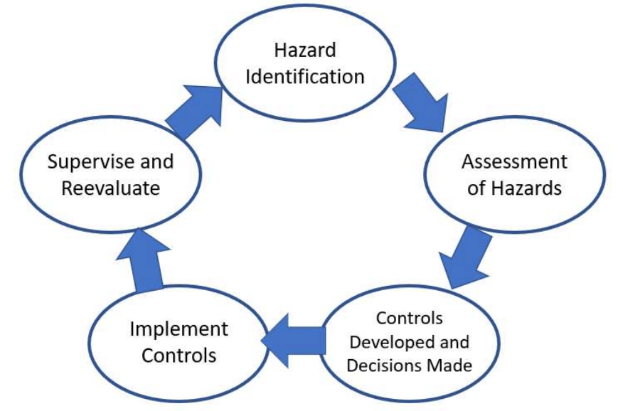 Explanation: The risk management process is comprised of 5 basic steps. The first and most important step in the risk management process is Hazard Identification. Hazard Identification is a continuous process and should be repeated. Once all known hazards have been identified, they must be assessed in terms of their probability and severity to determine the risk level. The next step is Controls Developed and Decisions Made. In this step, it is necessary to develop controls to reduce the level of risk posed by the hazards. After assessing each hazard, supervisors and managers develop one or more controls that either eliminate the hazard or reduce the risk. The next step is to Implement Controls. Management and supervisors must ensure that controls are added to standard operating procedures, instructions, and toolbox talks prior to the beginning of the task. Controls should be understood at all levels. The last step is to Supervise and Reevaluate. Managers and supervisors must ensure that employees understand how to use the controls. The manager or supervisor must continually assess the risks during the operational phase of the task. Methods to supervise and evaluate the effectiveness of control measures include spot checks, inspections, daily reports, and direct supervision. Auditing and inspecting is not a step in the risk management process.