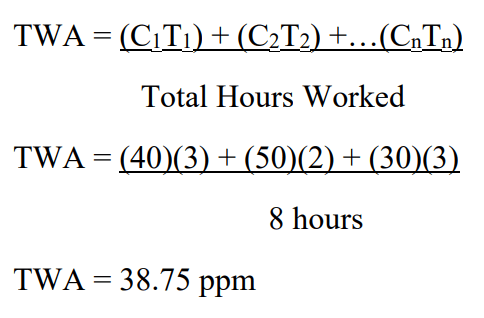 Calculate the Time-Weighted Average of the following scenario. An employee was exposed to Carbon Monoxide while on the diesel-powered forklift. She was exposed to 40 ppm for 3 hours, 50 ppm for 2 hours, and 30 ppm for 3 hours. a. 40 ppm b. 38.75 ppm c. 48.33 ppm d. 310 ppm