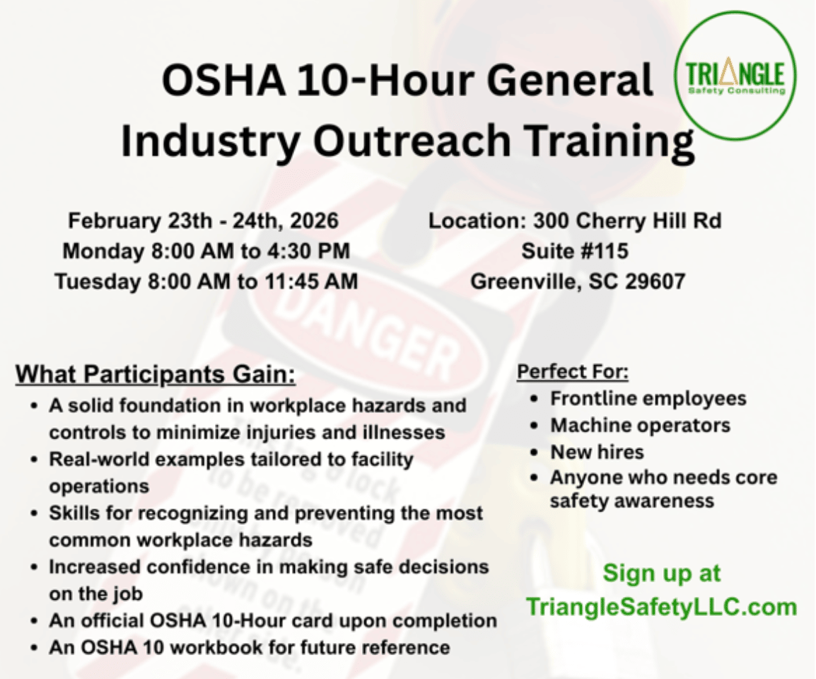 Price: $289 For employees who need essential safety awareness. Includes: Hazard recognition basics, real-world examples, OSHA 10 card, our workbook. Best For: New hires, frontline staff, machine operators. Location: SCMEP building located at 300 Cherry Hill Rd, #115, Greenville, SC 29607